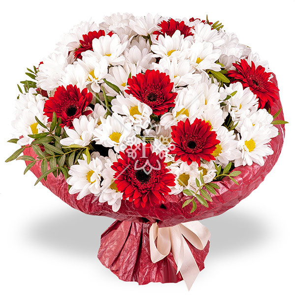 хризантема кустовая белая - 2 шт., гербера красная - 3 шт., декоративная зелень (фисташка), упаковка, лента.